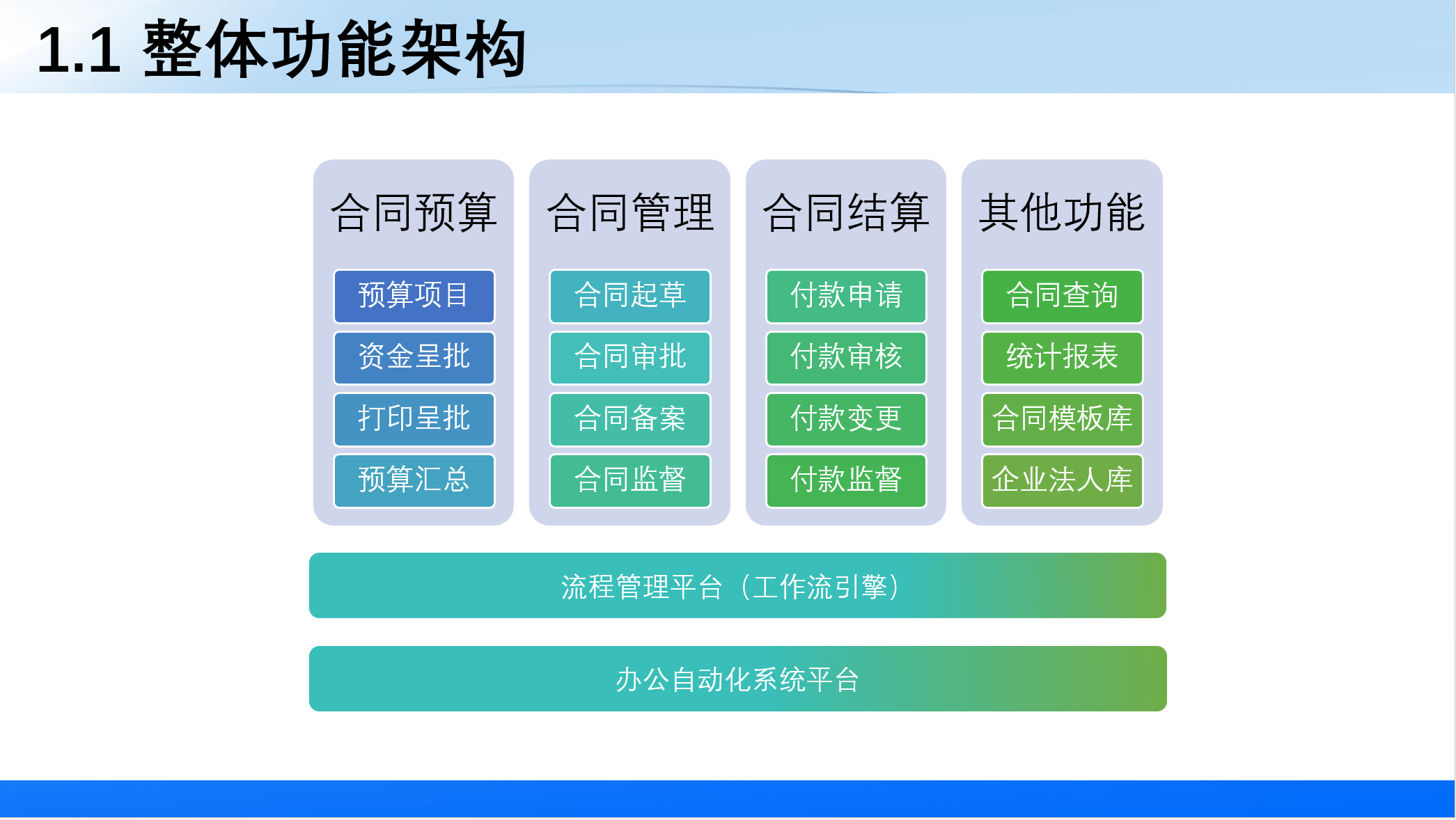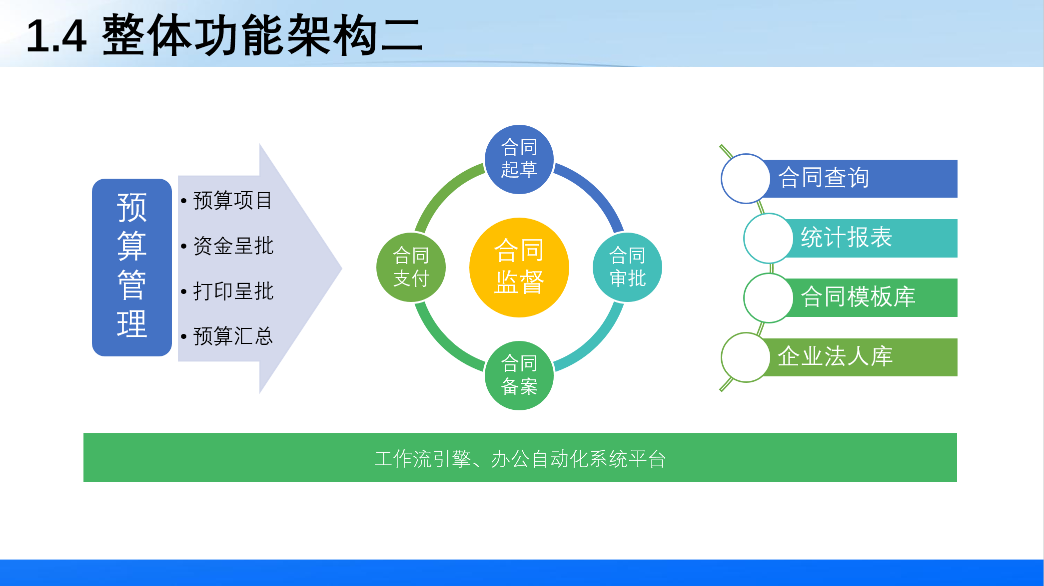实现合同预算、合同审批、合同备案、合同结算、合同监督的合同全周期闭环管理。 功能包含:合同起草、合同审批流程定制、合同备案、合同支付、合同监督、预算项目、资金呈批、合同模板、合同交接、合同关联补充协议&终止协议、合同提醒、合同条码、合同查询统计等功能。