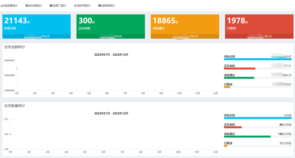 支持按时间、分类、部门、类型、进度生成合同统计图表,支持统计所有未付款合同