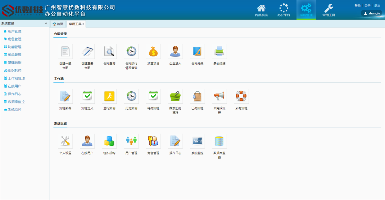 部门组织架构、用户管理、权限管理、在线用户、操作日志、定时任务、短信记录、系统与数据库监控、通知公告、意见反馈、帮助说明