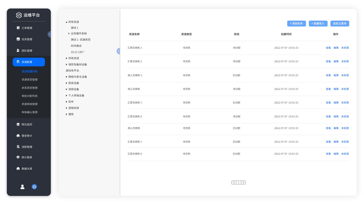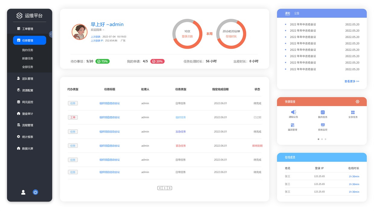 CMDB资源配置管理、流程编排、自动巡检、动环&设备监控、自动告警、工单处理、消息通知。